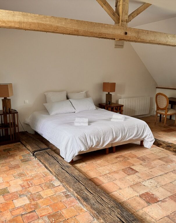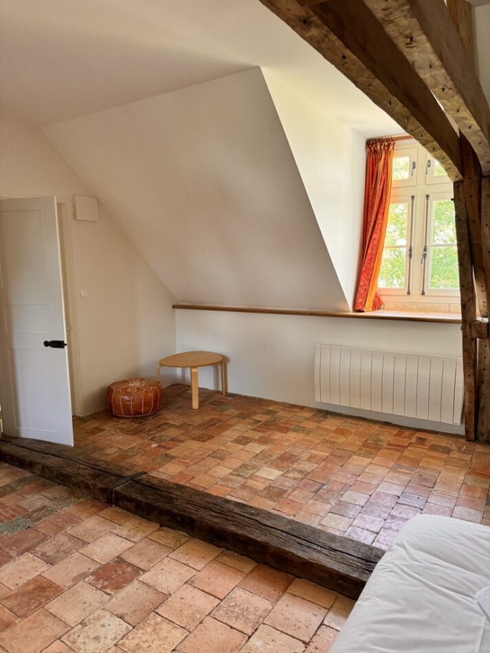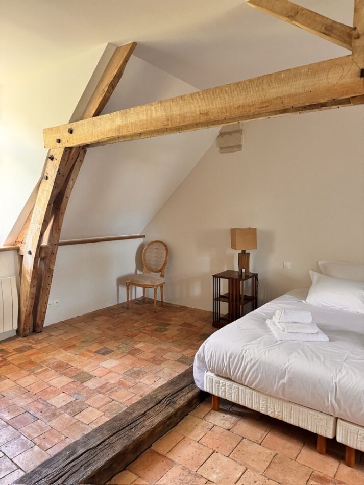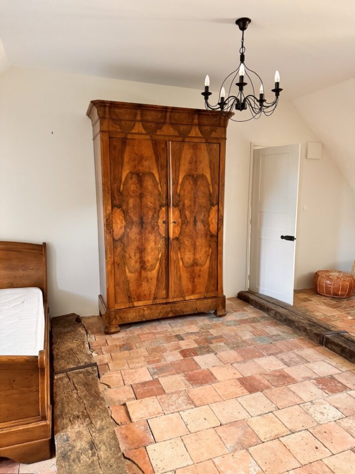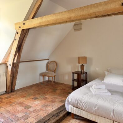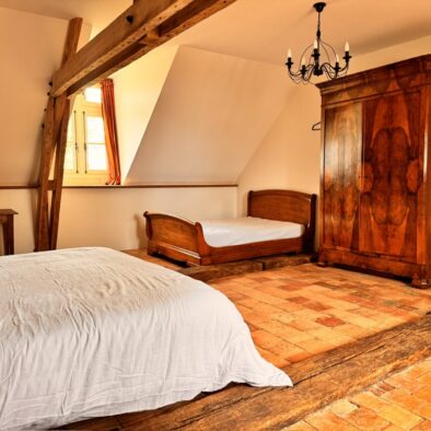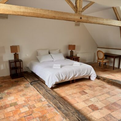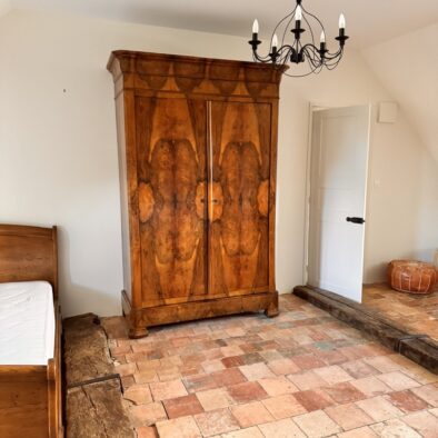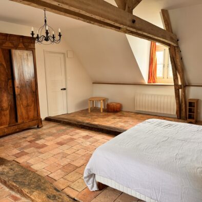 La Haute-Savoie vous accueille dans un espace généreux baigné de lumière naturelle, traversant sur la cour et le parc. Ses poutres en chêne, son sol en tomettes et son armoire ancienne composent une atmosphère chaleureuse, propice au repos et à la déconnexion.