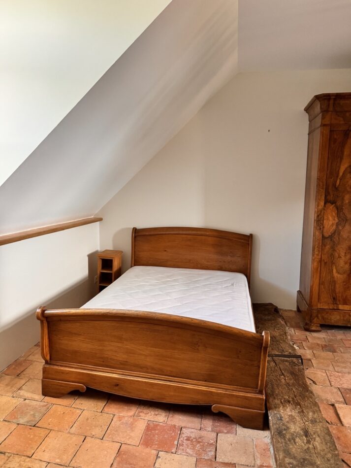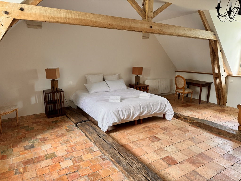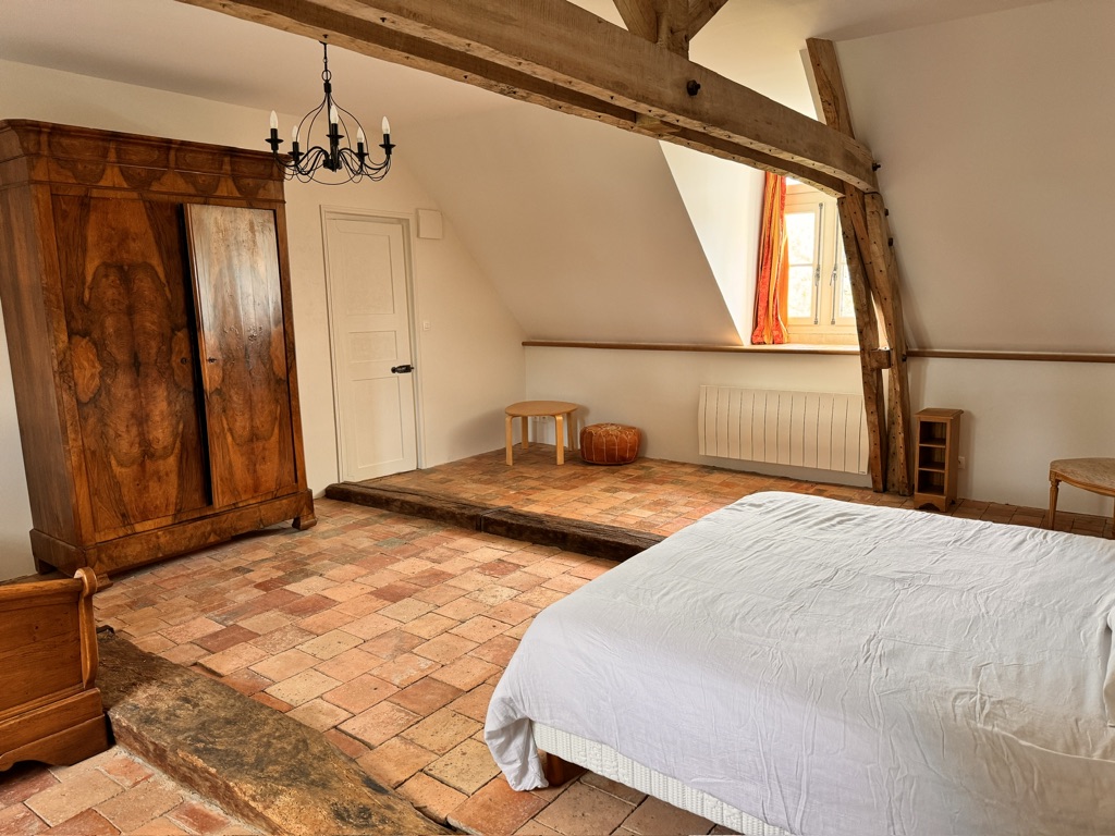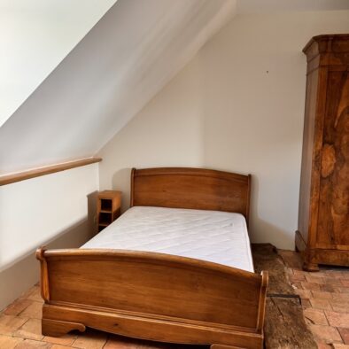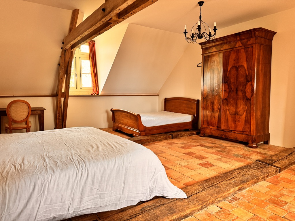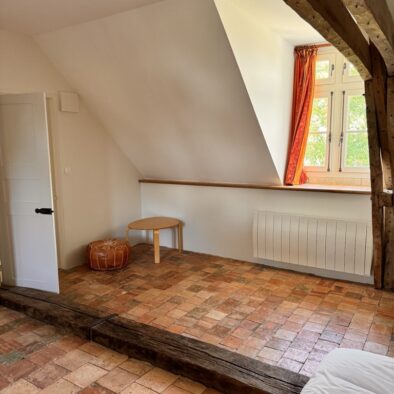 La Haute-Savoie vous accueille dans un espace généreux baigné de lumière naturelle, traversant sur la cour et le parc. Ses poutres en chêne, son sol en tomettes et son armoire ancienne composent une atmosphère chaleureuse, propice au repos et à la déconnexion.